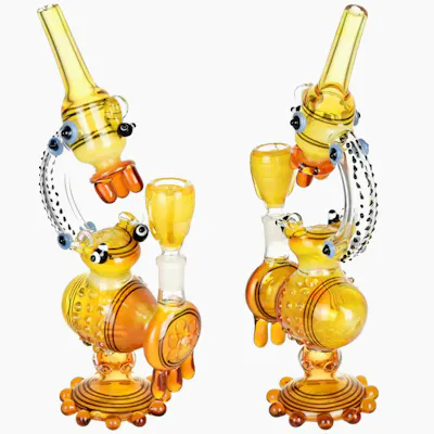 Bee Sweet with the Bee Microscope Water Pipe! Introducing the Bee Microscope Water Pipe! ?? This unique and intricate water pipe looks like it was crafted straight from the honeycomb! ?? It's 11 inches tall and made of colorful worked glass, giving it a unique, dripping honey look that will make it the envy of all your friends. ?? This honey-licious water pipe features busy honeybees ?? doing their thing and an overall sweet theme while elevating the scientific side. ?? The microscope-shaped water pipe is outfitted with a 14.5mm female joint and a fixed downstem diffuser for smooth and delicious hits. ?? Included is a 14.5mm bowl-style male herb slide for easy loading. ?? Whether you're looking for your daily go-to piece or something to show off to your friends, the Bee Microscope Water Pipe is the perfect choice! ?? With its intricate design and sweet honey look, this pipe is sure to become your favorite.