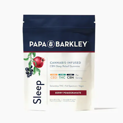 Papa & Barkley Sleep releaf gummies 5 mg thc, 5 mg cbd, 5 mg cbn per serving . solventless thc full spectrum • vegan berry pomegranate net wt. 2.82 oz. 80 g 20 gummies per package 100 mg cbd, 100 mg thc, 100 mg cbn per package