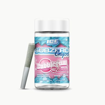 Ice Subzero Cryo Infused prerolls 5pk. Bubblegum Gelato, also known as “BG Gelato” or “Bubble Gum Gelato,” is a slightly indica dominant hybrid strain (60% indica/40% sativa) created through crossing the classic Gelato #45 X Indiana Bubblegum strains. Named for its delicious flavor, Bubblegum Gelato brings on a super relaxing and creative high that's perfect for a lazy weekend day spent at home. This bud has a sweet raspberry and cherry flavor with hints of sugary bubblegum to it, too. The aroma is just as fresh, with a sweet and fruity overtone that's accented by sugary bubblegum and rich cherries. The Bubblegum Gelato settles in a few minutes after your final toke, filling your mind with an uplifting and expansive euphoria that pushes away any negative or racing thoughts almost immediately. As your mind settles, a sense of creativity will wash over you, lending itself well to any artistic task that you may have at hand. With these relaxing and lifted effects and its high 16-19% average THC level, Bubblegum Gelato is often chosen to treat those suffering from conditions such as chronic pain, appetite loss or nausea, chronic stress, insomnia and chronic fatigue. Bubblegum Gelato buds have fluffy oversized forest green nugs with long thin orange hairs and a coating of tiny golden amber crystal trichomes.