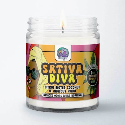 The Sativa Diva candle delivers an energizing, vibrant vibe with its bright citrus and smooth coconut palm scent. Made with a premium coconut apricot wax blend, it offers a clean, long-lasting burn with active enzymes to eliminate odors, perfect for enhancing cannabis sessions or mindful rituals.