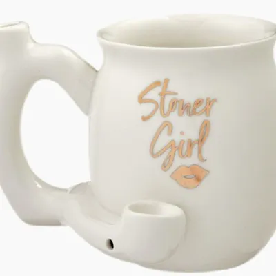 Stoner Girl Mug Pipe. Available in a variety of colours. Attached to the front of the mug is a pipe where you can pack your smoking herbs and light it. The smoke filters up the hollow handle to the mouthpiece on the top, allowing you to enjoy a smoke with your steaming coffee. It is microwave and dishwasher safe.