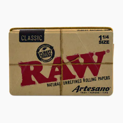 RAW's Artesano pack contains 32 sheets of 1 1/4" rolling papers, 32 perforated tips and a pop-out spring-loaded paper rolling tray. The entire pack closes securely using a convenient paper-fold-over system and a single magnetic closure. Made from a hybrid blend of unbleached (not chlorine-whitened) hemp and flax fibres with no additives, the thin, vegan-friendly paper is a translucent natural light brown with an acacia gum line. Each paper features RAW's patented crisscross watermark that helps prevent runs and maintains the even-burning characteristics.Â