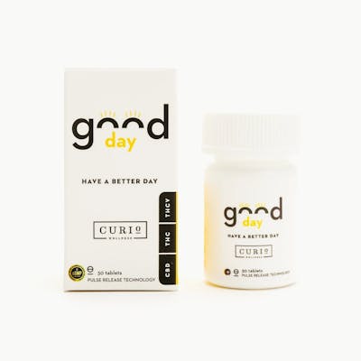 - Dose per Tablet: 10mg CBD:5mg THC:5mg THCv - Onset Activation Time: 30-60 minutes - Duration: 4-6 hours - Curio's Good Day tablets combine an ideal ratio of CBD, THC, and THCv, specifically designed to help address stress and anxiety and promote focus and concentration. They’re powered by Curio's proprietary pulse-release technology which delivers the cannabinoids in two doses for sustained performance and enhanced effectiveness.
