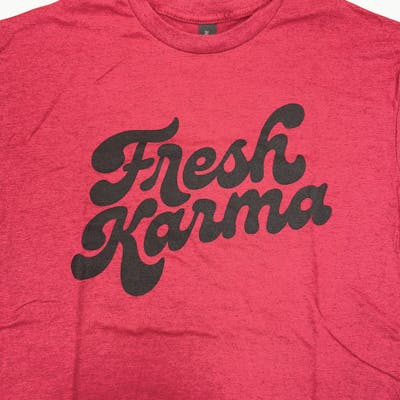 Rep local business with our "Fresh Karma" short sleeve t shirt! Available in red. 90% cotton crew cut shirt with 10% polyester. Sizes S-2X