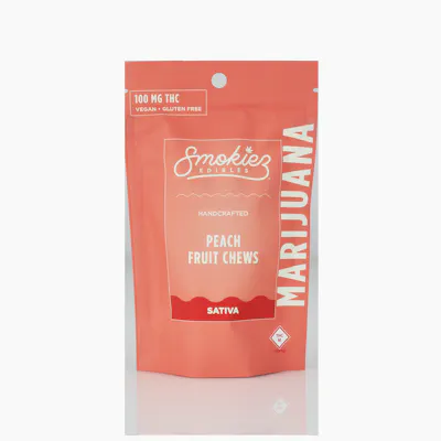 Enhanced with real cannabis terpenes! Smokiez Peach Fruit Chews are NOT YOUR AVERAGE FRUIT CHEWSTM These delicious fruit chews are a tasty and satisfying way for you to medicate! They are also Vegan, Gluten Free, Dairy-Free, and contain NO High Fructose Corn Syrup. Each of our mouth watering fruit chews contain 10 mg of THC, and made with our high clarity cannabis distillate for great taste. There are 10 pieces per package with 100 mg active THC per package. Smokiez Fruit Chews come in both sweet and sour flavor profiles