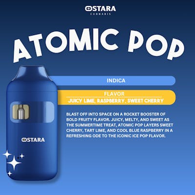 Flavor: Juicy Lime, Raspberry, Sweet Cherry Blast off into space on a rocket booster of bold fruity flavor. Juicy, melty, and sweet as the summertime treat, Atomic Pop layers sweet cherry, tart lime, and cool blue raspberry in a refreshing ode to the iconic ice pop flavor.