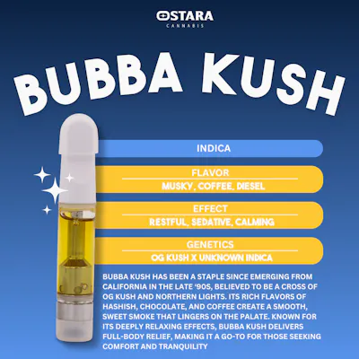 Flavor: Musky, Coffee, Diesel Effect: Restful, Sedative, Calming Genetics: OG Kush x Unknown Indica Bubba Kush has been a staple since emerging from California in the late '90s, believed to be a cross of OG Kush and Northern Lights. Its rich flavors of hashish, chocolate, and coffee create a smooth, sweet smoke that lingers on the palate. Known for its deeply relaxing effects, Bubba Kush delivers full-body relief, making it a go-to for those seeking comfort and tranquility.