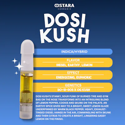 Flavor: Diesel, Earthy, Lemon Effect: Energizing, Euphoric Genetics: Do-Si-Dos x OG Kush Dosi Kush's stanky, sour funk of burned tire and gym bag on the nose transforms into an intriguing blend of lemon pepper, cookie and skunk on the palate. An earthy spice gives way to bright, sweet lemon glaze underpinned by warm black pepper. Heavy, exhaust-tinged diesel hangs in the air, commingling with skunk and then citrus to create a bright, lingering gassy lemon on the finish.