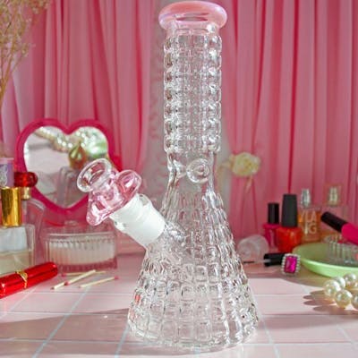 This bong has that crystal look all over. Classy meets function with this piece- she's positively gorgeous and we are obsessed! The texture of this glass so so pretty, and you really can't go wrong with a classic beaker shape! Features: - a 14mm pink heart shaped slide - an ice catcher - removable 5" downstem with inline perc - classic beaker shape - made of borosilicate glass - comes in a custom box! Measures 9.5" tall