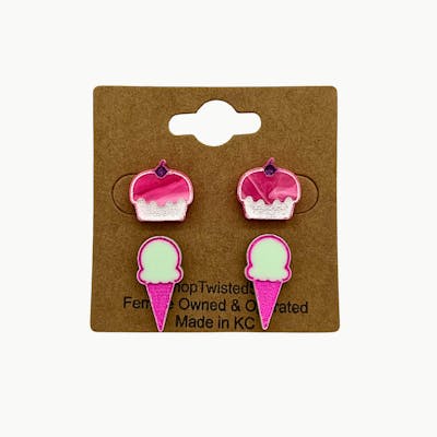 Add a sprinkle of sweetness to your look with the Cupcake & Gelato Stud Pack by Twisted Sis. This playful set includes one pair of pink cupcake studs topped with cherries and one pair of pastel green gelato cone studs with hot pink accents. Perfect for mixing, matching, or gifting, these earrings are lightweight, fun, and full of personality. Handcrafted in Kansas City by a female-owned business.