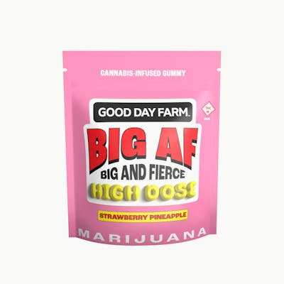 Is bigger better? We certainly think so, and we have the gummy to prove it. The Big AF Gummy is here to deliver a MEGA punch of cannabis power and fierce flavors like sweet, tropical Strawberry Pineapple. We've made it easy for you – this giant gummy is scored into 10 parts, so you can carve out your own adventure. *Big AF is short for “Big and Fierce,” but we have been told it means something else... 50mg THC per serving (1/10 gummy) | Activation time is 15-120 min. | Melt-Proof, Gluten-Free, Vegan, Made with Real Fruit Good People. Good Gummy. Good Day.