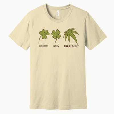 Experience the charm of our Super Lucky T-Shirt from From the Earth! This tee boasts a delightful design featuring symbols of fortune and cannabis goodness. On the left, a classic three-leaf clover with the word 'normal' invites a nod to tradition. Adjacent, a four-leaf clover with 'lucky' underneath symbolizes the extra bit of serendipity. And to the right, a bold marijuana leaf proudly proclaims 'super lucky,' highlighting the potent positivity of cannabis. Crafted with soft, breathable fabric and sporting a playful yet stylish design, our Super Lucky T-Shirt is your go-to for spreading good vibes and embracing your inner luck.