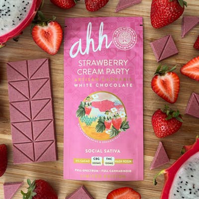 Flower Equivalent: 5.93g -- Strawberry Cream Party White Chocolate 2:1 CBG: THC Sativa Description This LIMITED EDITION, pink colored, “strawberries & cream” flavored white chocolate is a celebration! The fresh, gentle flavor of ripe strawberries nestled in rich cream, mingles with the terps from the rosin, lovely. Infused with award winning Treeworks Hash Rosin, using carefully selected Sativa leaning strains. Complemented by 200 mg CBG and delicious, nutrient dense dragon fruit, this hand crafted edible’s unworldly color, flavor and punch were made for the outgoing cannabis enthusiast… Play in Pink Paradise! 200 mg CBG: 100 mg THC Hash Rosin Organic Ingredients | Fair-Trade & Ethically Sourced Full Spectrum Small Batch Effects ? Social ? Uplifting ? Happy Ingredients Fair Trade 31% White Chocolate, Treeworks Cannabis Solventless Hash Rosin, CBG, Strawberries, Dragon Fruit, 100% Loving Intentions -- Expiration Date: 2026-09-01