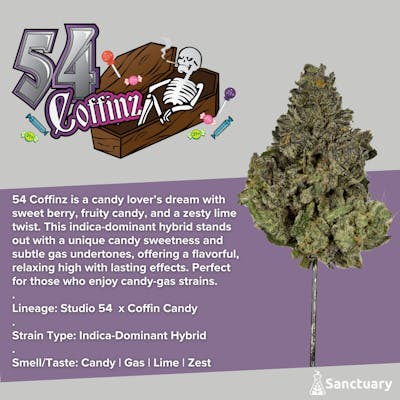 TAC: 24.51% | CBG: 0.16% | CBGA: 0.65% | THC9: 0.91% | THCA: 22.61% | THCVA: 0.18% | Flower Equivalent: 28g -- 54 Coffinz is a candy lover’s dream with sweet berry, fruity candy, and a zesty lime twist. This indica-dominant hybrid stands out with a unique candy sweetness and subtle gas undertones, offering a flavorful, relaxing high with lasting effects. Perfect for those who enjoy candy-gas strains. Lineage: Studio 54 x Coffin Candy .Strain Type: Indica-Dominant Hybrid Smell/Taste: Candy Gas Lime Zest -- Expiration Date: 2026-07-01