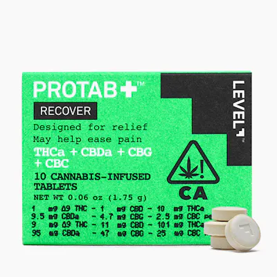 Sore from a recent workout or need help managing discomfort? The LEVEL Recover Protab+ may provide the relief you’re seeking. Each extra-strength tablet is formulated by precisely combining highly functional cannabinoids that contain 10 mg THCa, 10 mg CBDa, 5 mg CBG, and 3 mg CBC to help you rest, recover, and carry on. Onset takes 30–90 minutes, with a duration of 3–6 hours. Don’t assume your normal edible dose is your Protab+ dose. Start with half or one, and then work up from there. LEVEL tablets are scored to be easily split in half. LEVEL is a science-driven cannabis company on the cutting edge of cannabinoid research and innovation that is passionate about helping to guide humans with the information and products they need in order to make informed decisions and take action. We launched LEVEL with one goal in mind: to create unique, targeted effects-based cannabis products by formulating cannabinoids in ratios not accessible from the plant alone. LEARN MORE HERE