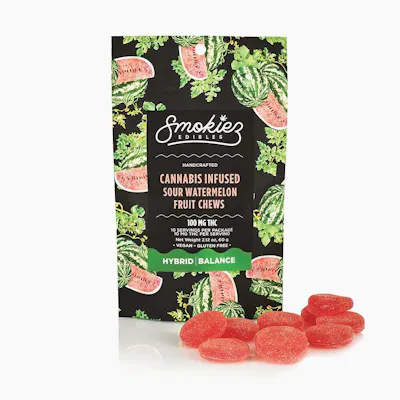 Smokiez Sour Watermelon Hybrid Fruit Chews are NOT YOUR AVERAGE FRUIT CHEWS™ ;) These fruit chews taste like a tart and juicy watermelon, with a pleasant balance of fruity and citrusy notes. These delicious fruit chews are a tasty and discreet way for you to medicate! They are also Vegan, Gluten Free, Dairy-Free, and contain NO High Fructose Corn Syrup. Each of our mouth watering fruit chews contain 10 mg of THC, and made with our high clarity cannabis distillate for great taste. There are 10 pieces per package with 100 mg active THC per package.