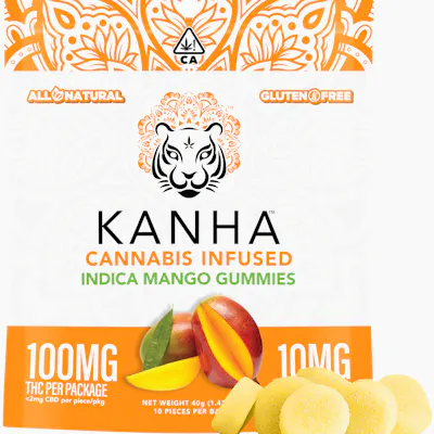 KANHA Mango Indica Gummies 10 pieces x 10mg/gummy = 100mg/bag Mango fruits and indica plants, two natural gifts that likely originated on the Indian subcontinent, are ripe with positive synergies and spiritual connotations that make them a perfect pairing for a real-fruit gummy. Featuring 10mg of THC per gummy and fruit-forward terpenes like linalool, Mango Indica delivers sweet nirvana to your taste buds and a steady calm to your mind and body. Instructions: Eat 1 serving, or half a piece. Wait 2 hours for full effect. Keep in a cool, dry place. Avoid temperatures over 75°F. Ingredients: Tapioca Syrup, Cane Sugar, Water, Gelatin, Agar, Locust Bean Gum, Citric Acid, Carnauba Wax, Natural Flavor, Cannabis Oil, Natural Color, and Natural Indica Terpenes.