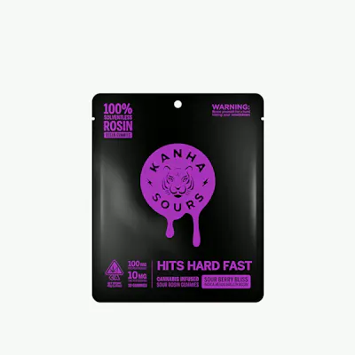 KANHA Indica Sour Berry Bliss Rosin Sours 10 pieces x 10mg/gummy = 100mg/bag Berry sourness that chills you out. Sour Berry Bliss vegan gummies contain 10mg of fast-acting THC per piece, featuring solventless rosin from Mendo Breath indica strain. With 100mg THC per pack, these gummies will smack you into chill mode. Solventless Rosin Vegan Fast-Acting NANO Strain-specific Hits like flower Instructions: Eat 1 gummy. Onset starts around 5-15 minutes. Wait 60 minutes for full effect. Keep in a cool, dry place. Avoid temperatures over 75°F. Ingredients: Vegan Sugar, Tapioca Syrup, Water, Malic Acid, Pectin, Natural Flavor, Citric Acid, Tartaric Acid, Sodium Citrate, Natural Fruit Concentrate, Solventless Rosin Cannabis Extract, VESIsorb Nanotechnology, Natural Color Flavors Nutty Pine Sweet