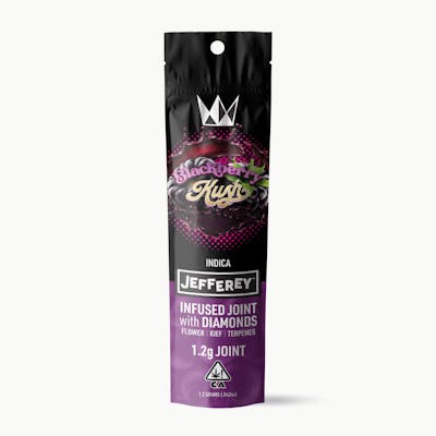 The Jefferey Blackberry Kush Infused single is an Indica-leaning Jay with diffused effects. Helping the overtaxed consumer to “Keep Calm and Carry On,” the “Blackberry Kush” Jefferey is crafted from meticulously grown Premium Flower, packed with Live Resin Diamonds, sprinkled with kief from our Top Shelf Flower, and coated with a subtle layer of all-natural terpenes. Eat, drink, and be Berry, the effects from this 1.2G infused joint instills a laid-back summer-like vibe.