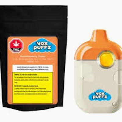 VoxPuffz Peach Melonberry rechargeable All-in-One Vapes have a Voxtastic 1000mg of THC, and are triple distilled for purity and smoothness. From your very first puff to the last, you’ll sink into the deliciously sweet peach, raspberry, and watermelon flavour. This indica-dominant, distillate vape contains botanical terps with 80-83% THC.