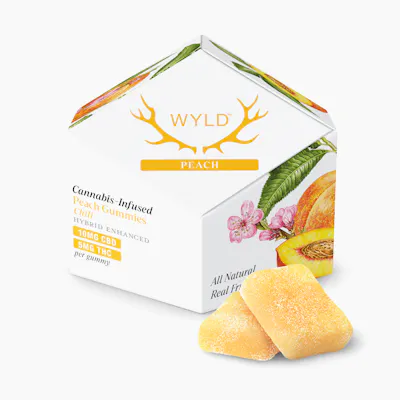 A double dose of CBD paired with THC in Wyld Peach gummies turns mundane tasks into your new favorite adventure. Made with real fruit and enhanced with a balanced Hybrid terpene profile that may assist in creating a sense of ease and overall well being. --- Balanced | Chill --- 100mg CBD:50mg THC per package, 10mg CBD:5mg THC per gummy --- Ingredients: Sugar, Tapioca Syrup, Water, Peach Juice Concentrate, Gelatin, Coconut Oil, Citric Acid, Natural Flavoring, Pectin (Pectin, Sodium Citrate), Hemp Extract, Cannabis Extract, Sunflower Lecithin --- Contains: Coconut