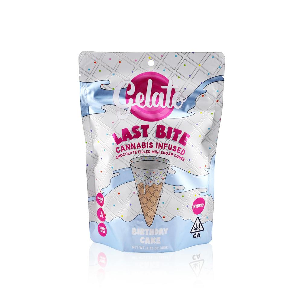 Enjoy our NEW Last Bites feature a birthday cake white chocolate filling, birthday cake white chocolate dip, and a special sprinkle coating.?This 10ct of 10mg hyrbid dosed cones are perfect for anyone looking for a sugary snack with a crunch. They are best enjoyed topped with a scoop of your favorite ice cream flavor.