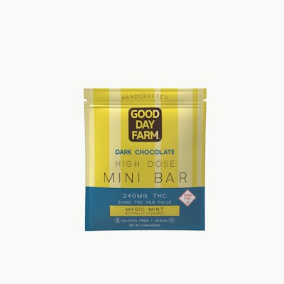 "Good Day Farm has combined the best of both worlds: silky dark chocolate and fresh mint, for a delicious taste that’ll add a little bit of mint magic to your day. 30mg THC per piece, 240mg THC per bar | Activation time: 15-120 min | Handcrafted, Vegetarian, Gluten-Free Good People. Good Chocolate. Good Day."