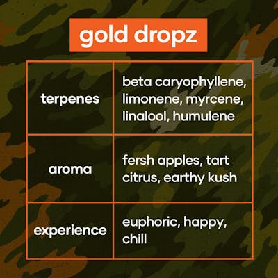 "Gold Dropz LINEAGE: Apples and Bananas x Spritzer CLASSIFICATION: Hybrid TERPENES: Beta Caryophyllene, Limonene, Myrcene, Linalool, Humulene AROMA: Fresh Apples, Ripe Bananas, Earthy Kush FLAVOR: Orchard Fruits, Tart Citrus, Floral EXPERIENCE: Euphoric, Happy, Chill STRAIN DESCRIPTION: We believe our community deserves the gold standard, and we found it with this strain. Gold Dropz is the perfectly balanced hybrid born from A-list parents Apples & Bananas and Spritzer. Unlock an aroma that’s pure treasure. Gold Dropz greets you with the scent of a fresh orchard with crisp apples and ripe bananas, layered over a base of sweet grape and earthy kush. The flavor is just as rich, delivering a burst of juicy orchard fruit and tart citrus on the inhale, followed by a subtle floral finish on the exhale. This is the ultimate all-day hybrid, well balanced for any moment. Gold Dropz is known to deliver a bright, mood-lifting euphoria that sparks a positive mindset. This happy head high is said to be paired with a gentle, relaxing body feeling that keeps you calm, but doesn't weigh you down. It’s the perfect code for whatever your day holds."