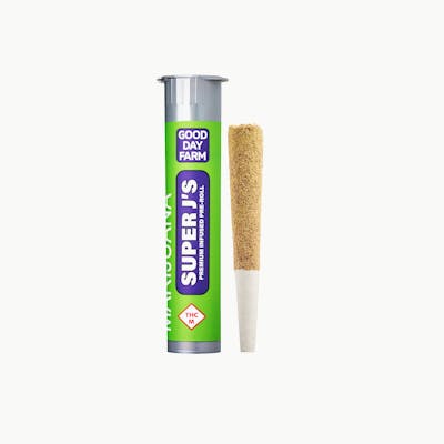 Good Day Farm Super J's are 1g pre-rolls that are super-infused for superior power and superior flavor. But how do we make this sativa pre-roll superpowered? We start with Good Day Farm premium, full flower and super-infuse it with an explosion of flavorful terpenes and potent cannabis oil. We take a full gram of that THC-loaded flower, roll it with organic papers, and coat it with a supersuit of premium kief. Super J's are our most potent and flavorful pre-roll, so you can fly a little higher. Strain-Specific | Super-Infused | Ready to Spark Super People. Super Cannabis. Super J's.
