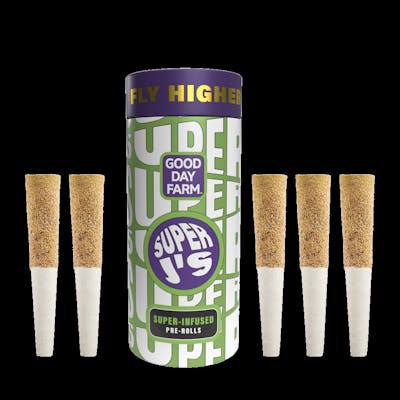 Good Day Farm Super J's packs are filled with five 0.5g pre-rolls that are super-infused for superior power and superior flavor. We start with Good Day Farm premium, full flower and super-infuse it with an explosion of tropical fruit terpenes and potent cannabis oil. We take that THC-loaded flower, roll it with organic papers, and coat it with a supersuit of premium kief. With five infused pre-rolls to a pack, you can fly a little higher (and keep going back for more)! Strain-Specific | Super-Infused | Ready to Spark Super People. Super Cannabis. Super J's.