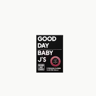 Ooh, baby. Good Day Baby J’s are here to remind you that GOOD things come in small packages. Good Day Baby J’s are filled with 0.3G of smooth premium flower and delicately rolled with organic hemp papers. With five mini pre-rolls to a pack, they’ll keep you coming back for more. These babes are the total package: quick, convenient, and, quite honestly, they couldn’t be cuter. Remember, size isn’t everything. Smoke one, baby. Strain-Specific | Ready to Spark | 5 Pre-Rolls per Pack Good People. Good Cannabis. Good Day Baby J's. "Tire Fire is an indica strain that we promise is better than it sounds! This strain has diesel and nutty flavors with a peppery, spicy kick. This strain leaves patients feeling calm and hungry with a pronounced body high. This strain is known to help with relaxation - perfect to decompress after long days or enjoy during a relaxing activity. LINEAGE: High Octane OG x Dosido CLASSIFICATION: Indica TERPENES: Beta Caryophyllene, Limonene, Linalool, Myrcene, Humulene FEEL GOOD STATES: Soothe, Unwind AROMA: Nutty, Pepper, Spice FLAVOR: Pungent, Sipcy, Diesel FEELS LIKE: Calm, Hungry"