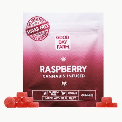 "Good Day Farm Sugar-Free Raspberry Gummies are ripe with sweet, tart raspberry flavor with a hearty dose of cannabis goodness. Our sugar substitute mimics the sweetness of sugar with a significantly lesser effect on blood glucose. Infused with our premium, high potency cannabis oil, these gummies are perfect for patients seeking a smoke-free and sugar-free experience. 10mg THC per piece | Activation time: 15-120 min | Sugar-Free, Melt-Proof, Gluten-Free, Vegan, Made with Real Fruit Good People. Good Gummies. Good Day."