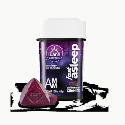 Fast Asleep - Dream Berry . Per Package: 100mg CBD, 20mg CBN, 20mg CBG, 20mg THC, 10mg Melatonin . Per Piece: 10mg CBD, 2mg CBN, 2mg CBG, 2mg THC, 1mg Melatonin Feel sleepy in just 5-15 minutes ... with no next-day grogginess. These revolutionary nighttime gummies deliver a sweet mixed berry flavor, along with a custom blend of CBD, THC, CBG, CBN, and melatonin. They're also enhanced with more than 30 specialized terpenes, curated based on Al-generated data from thousands of consumer experiences - and all delivered via fast-acting molecular encapsulation technology.