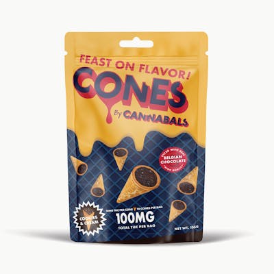 Cannabals | Cookies & Cream Chocolate Cones | 100mg THC (10-Pack) Sweet. Crunchy. Nostalgic. These Cookies & Cream Chocolate Cones blend smooth Belgian-style milk chocolate with crunchy cookie pieces for a classic flavor combo that never misses. Each pack contains 100mg THC total (10mg per cone), making dosing simple and consistent. Creamy chocolate meets cookie crumble and crisp cone for a perfectly balanced bite every time. Flavor Profile • Taste: Rich milk chocolate with sweet cookie crunch • Texture: Silky chocolate layered with crisp cookie pieces • Finish: Creamy, slightly cocoa-forward with a satisfying crunch A nostalgic dessert flavor elevated with precision infusion. Potency • Total THC: 100mg per pack • 10mg THC per cone Evenly portioned for easy, controlled enjoyment. Ingredients Milk chocolate (sugar, cocoa butter, whole milk powder, unsweetened chocolate, lecithin [soy], natural vanilla flavor), cone (wheat flour, sugar, coconut oil, rapeseed lecithin [emulsifier], salt), cookie crumble (enriched wheat flour [wheat flour, niacin, reduced iron, thiamine mononitrate, riboflavin, folic acid], palm oil, sugar, eggs, cocoa, chocolate liquor, cocoa butter, water, invert sugar, baking soda, artificial vanilla flavoring, lecithin, salt), cannabis extract. Indulge responsibly and enjoy some Good Daze — creamy, crunchy, and perfectly dosed.
