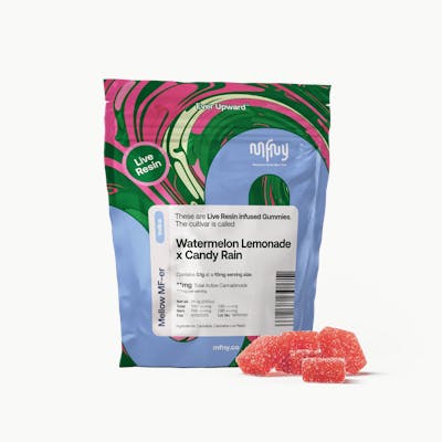 terpene-rich edibles at an even tastier price. Introducing our live resin Watermelon Lemonade x Candy Rain gummies. These vegan gummies are infused with MFNY’s single-source, in-house produced Candy Rain live resin. We start with fresh-frozen flower buds, then use the hydrocarbon extraction method (plus years of experience and scientific precision) to deliver the purest plant extract. An extract that showcases the cultivar's naturally-produced, full-spectrum cannabinoids and remarkable natural terpenes. Candy Rain is known for its sweet candy flavor. To complement the Candy Rain cultivar, we add the minimum amount of sugar, plus watermelon lemonade flavors.
