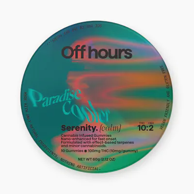 FLAVOR: Paradise Cooler TERPENES: Special calming blend SIZE: 10ct STRENGTH: 100mg THC (10MG/Serving) + 20MG CBD (2MG/Serving) Chill out with Off Hours Paradise Cooler Serenity gummies. Developed with a calming blend of Terpenes, THC, CBD, and CBN, these gummies are the perfect escape. SUGGESTED USE: Start with 1/2 of a gummy. Wait 1 full hour before increasing dose. INGREDIENTS: Organic Cane Sugar, Reverse Osmosis Water, Organic Tapioca Syrup, Organic Fruit Juice From Concentrate, Fruit Pectin, Organic Fruit Flavoring, Natural Food Coloring, MCT Oil, Cannabis Extract, Soy Extract, Terpenes