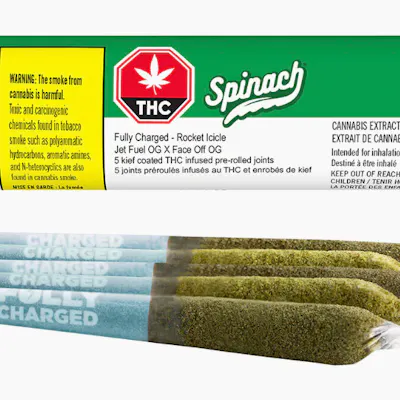 Be ready to soar over the moon with an infused pre-roll that's made with high-quality, high potency cold-filtered cannabis extract and dusted in kief from the cosmos reaching 35%+ Total THC. Inspired by a strain with a Jet Fuel OG and Face Off OG lineage, Spinach Fully Charged Rocket Icicle infused pre-rolls are a delicious combination of flavour notes, with cherry and blueberry making sure you get to the end of that mission after each and every hit.