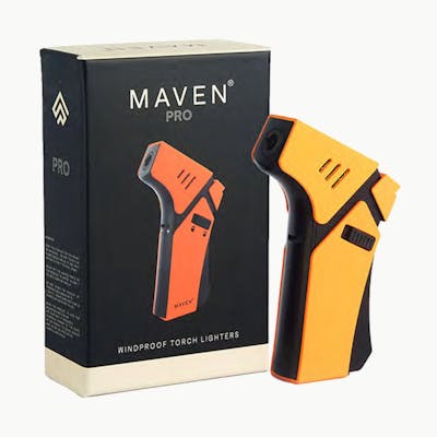 Maven Pro. Featuring a fashion forward design and ergonomic hand grip, Pro was designed to fit perfectly into both your pocket and hand. The thin and sharp flame is perfect for any precision lighting. Coming in a range of 10 colors, Pro is colored and designed to fit perfectly into any home setting. Retail Unit: One (1) Torch Size: 4.5" x 3" x 2" Single Windproof Jet Flame Adjustable Flame Safety Lock/Ignition Hold Butane Refillable