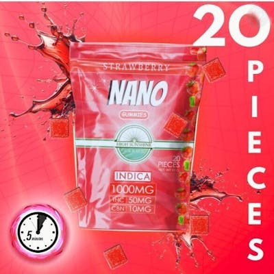 50mg THC | 10mg CBN Per GummyIntroducing our latest innovation: the 1000mg THC + CBN Indica Nano Gummies. Crafted with precision using our proprietary Nano distillate technology, these delightful strawberry-flavored gummies are designed to elevate your nightly ritual. Immerse yourself in the soothing embrace of our premium gummies, tailored to promote a tranquil night's rest. Each 1000mg bag contains 20 gummies, each infused with 50mg THC and 10mg CBN. Our Nano technology revolutionizes the edible experience by bypassing the traditional wait time and potential hangover associated with distillate edibles. Unlike conventional edibles, which require THC to undergo digestion and liver processing, resulting in a delay of 45-120 minutes and possible overconsumption, our Nano technology initiates effects within 5-15 minutes, offering a cerebral, heady high. This contrasts with the heavier, body-centric high often linked to distillate edibles, which can lead to lethargy in larger doses. With our rapid onset technology, cannabinoids enter the bloodstream immediately, providing THC effects lasting 2-3 hours for most individuals. Our patent-pending Nano technology ensures swift absorption rates and minimal wastage, guaranteeing you receive optimal value for your investment.