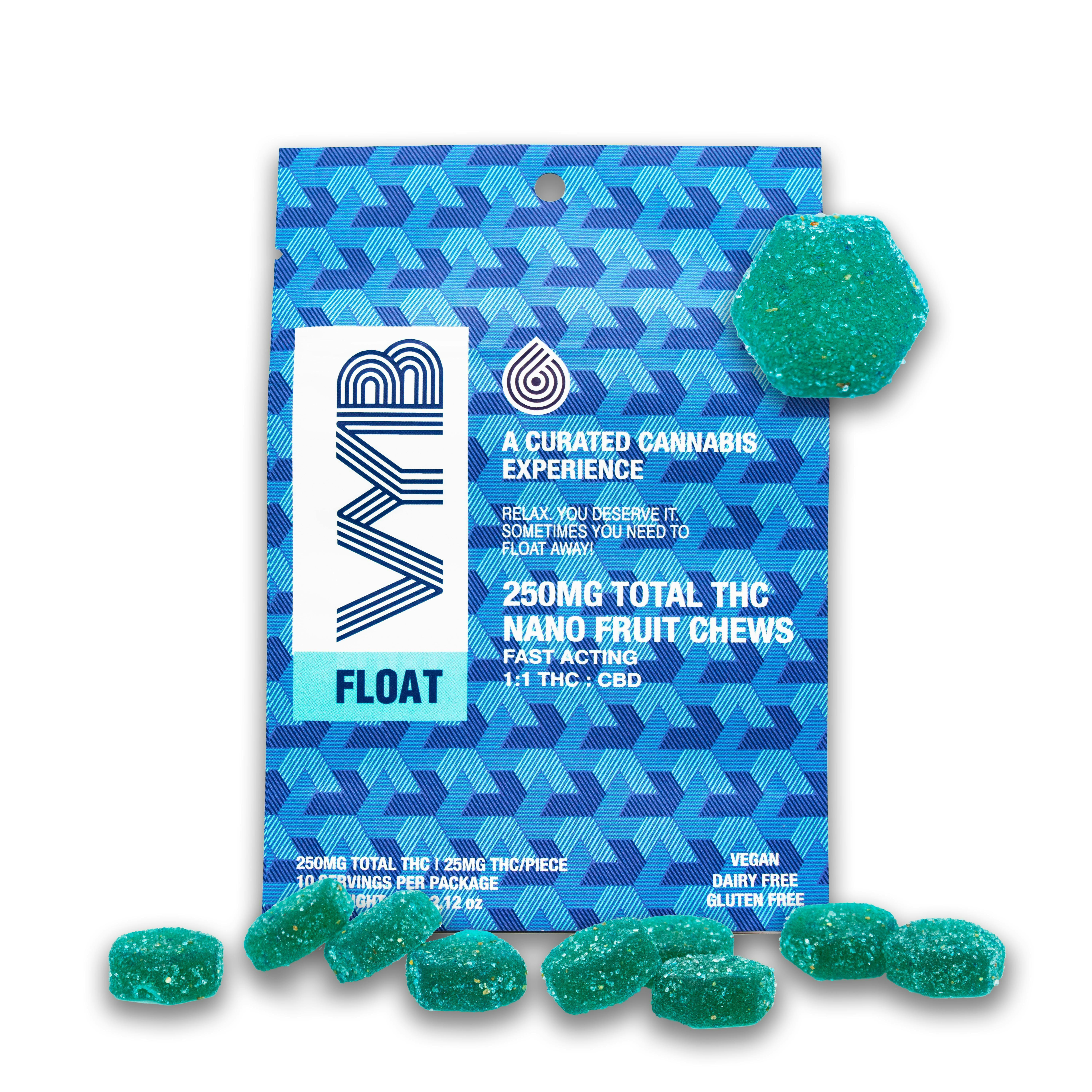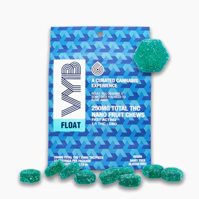Relax you deserve it, sometimes you need to float away!Formulated with relaxing, anti-anxiety effect based terpenes Myrcene , Linalool, and Limonene. Along with a 1:1 CBD to THC ratio that may tend to offer a minimal high while promoting relaxation, calmness, euphoria, and tranquility all you need to let your worries FLOAT away. The nano fruit chew is created with proprietary nanotechnology that enable faster onset (typically 15-30 mins) and increase absorption of cannabinoids that potentially increases the potency of the fruit chews.