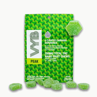 A little extra focus, take your concentration to its peak!Formulated with uplifting, and anti-inflammatory effect based terpenes Alpha-Pinene and Eucalyptol. Along with a 1:1 CBD to THC ratio that may tend to offer a minimal high while promoting relaxation, calmness, alertness, focus, and tranquility. When you need to be at your PEAK!The nano fruit chew is created with proprietary nanotechnology that enable faster onset (typically 15-30 mins) and increase absorption of cannabinoids that potentially increases the potency of the fruit chews.