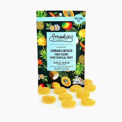 CBD:THC 1:1 | BALANCE A harmonic blend of CBD and THC, Smokiez Sour Tropical Fruit CBD:THC 1:1 Fruit Chews are NOT YOUR AVERAGE FRUIT CHEWS™ ;) These delicious fruit chews are a tasty and discreet way for you to medicate! They are also Vegan, Gluten Free, Dairy-Free, and contain NO High Fructose Corn Syrup. Each of our mouth watering fruit chews contain 10 mg of CBD and 10 mg of THC, and made with our high clarity cannabis distillate for great taste. There is 10 pieces per package with 100mg CBD + 100 mg active THC per package.