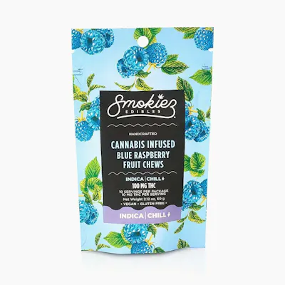 Enhanced with real cannabis terpenes! Smokiez Blue Raspberry Indica Fruit Chews are NOT YOUR AVERAGE FRUIT CHEWS™ ;) These fruit chews taste like fresh raspberries, with a juicy and slightly tangy taste that is reminiscent of ripe berries. These delicious fruit chews are a tasty and discreet way for you to medicate! They are also Vegan, Gluten Free, Dairy-Free, and contain NO High Fructose Corn Syrup. Each of our mouth watering fruit chews contain 10 mg of THC, and made with our high clarity cannabis distillate for great taste. There are 10 pieces per package with 100 mg active THC per package.
