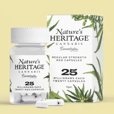 Powdered RSO in pill form - intended for patients wanting to create their own dosing schedule. Nature's Heritage RSO capsules are precision-dosed & available in low, medium & high dosages. Originally developed by Rick Simpson for topical application for skin cancer, RSO is a discreet & odorless cannabis concentrate used for more intense therapies. It contains all the original chlorophyll, terpenes, fats & waxes from the plant which keeps the cannabinoid ratios true.