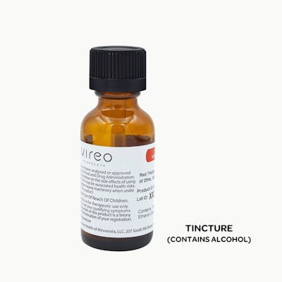Vireo Red products are predominantly THC, with a small component of CBD. With all Vireo products, a baseline level of CBD is present, since some studies suggest that CBD can reduce the unpleasant side effects of THC. -- Contains MCT oil (coconut-derived), Ethanol, 100% pure cannabis oil, Minnesota-grown hemp-derived CBD isolate. -- The primary active ingredients in this medication are delta-9-tetrahydrocannabinol (THC) and cannabidiol (CBD). -- THC: 625 mg/bottle CBD: Trace