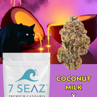 COCONUT MILK x BLACK PANTHER — 23.96% THC A smooth, dessert-leaning hybrid from 7 SEAZ® Premium Cannabis layering creamy coconut sweetness with dark fruit, spice, and subtle gas. Calm, euphoric, and luxuriously mellow. NY indoor-grown for refined flavor and silky smoke.
