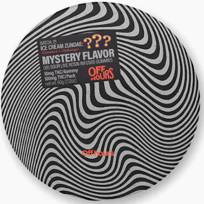 FLAVOR: Mystery SIZE: 10CT STRENGTH: 100MG THC (10MG/SERVING) LOOKING FOR A CLUE? NICE TRY. OFF HOURS “MYSTERY FLAVOR” LIVE ROSIN GUMMIES ARE DESIGNED TO KEEP YOU GUESSING. PAIRED WITH ICE CREAM ZUNDAE’S DESSERT AND CANDY NOTES, THEY DELIVER A CREATIVE AND CALMING HIGH THAT MIGHT JUST HELP YOU SOLVE THE MYSTERY... OR NOT. SUGGESTED USE: Start with 1/2 of a gummy. Wait 1 full hour before increasing dose. INGREDIENTS: Organic Cane Sugar, Reverse Osmosis Water, Organic Tapioca Syrup, Organic Fruit Juice from Concentrate, Fruit Pectin, Organic Fruit Flavoring, Natural Food Coloring, MCT Oil, Cannabis Extract, Malic Acid, Sunflower Lecithin