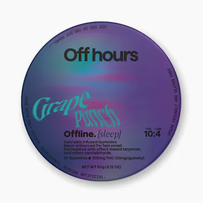 Flavor: Grape Punch Terpenes: special blend for rest Size: 10ct Strength: 100mg THC (10mg/serving) + 100mg CBD (10mg/serving) + 40mg CBN (4mg/serving) Off Hours grape punch flavored gummies are specially formulated with the perfect combination of THC, CBN, and CBD to send you fast asleep. Sweet dreams. Nano-enhanced cannabinoids for fast onset. Vegan friendly and gluten free. Suggested use: take 1 gummy 30-45 minutes before bedtime. Ingredients: organic cane sugar, reverse osmosis water, organic tapioca syrup, organic fruit juice from concentrate, fruit pectin, organic fruit flavoring, natural food coloring, MCT oil, cannabis extract, soy extract, terpenes