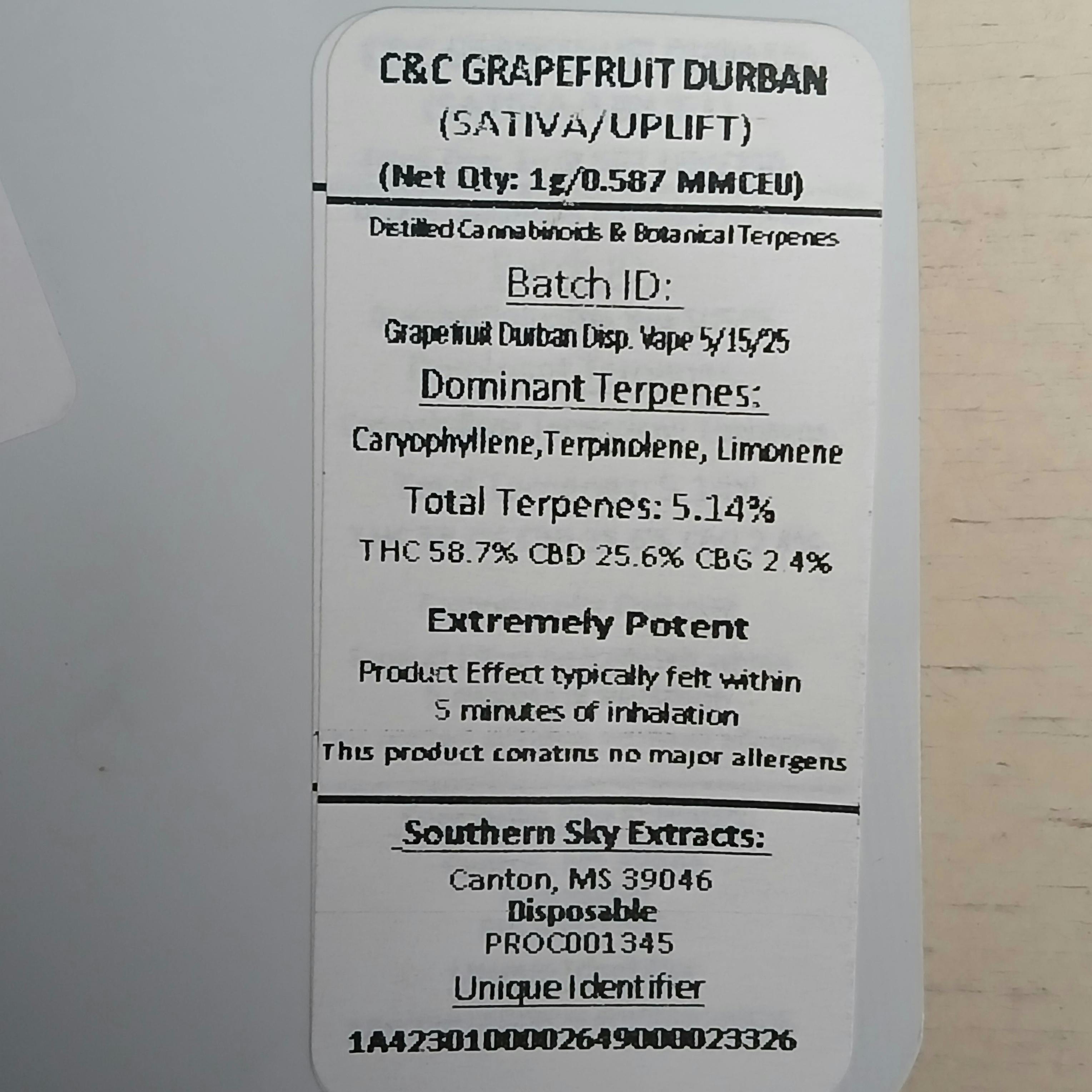 Southern Sky |Grapefruit Durban| 1g Vape Disposable