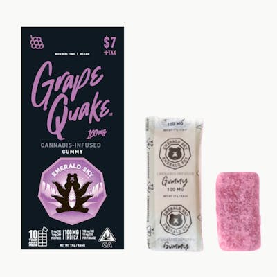 EMERALD SKY presents Grape Quake 100mg, a delicious cannabis-infused gummy that delivers 100mg of THC in a convenient, flavorful edible format. These gummies burst with bold grape flavor, offering a sweet and fruity taste experience that makes precise dosing enjoyable. Perfect for experienced consumers seeking potent effects, Grape Quake gummies provide a discreet and easy way to enjoy cannabis. Each gummy is crafted with quality ingredients to ensure consistent potency and taste. Whether you're unwinding after a long day or seeking relief, these grape-flavored gummies offer a convenient alternative to smoking or vaping. EMERALD SKY is known for creating high-quality edibles that combine great taste with reliable effects. Enjoy the rich, sweet grape notes in every bite while experiencing the benefits of this 100mg edible.